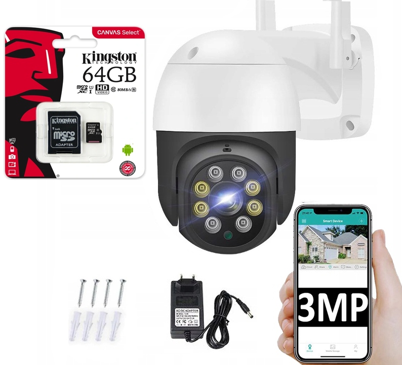 Kamera najnowszej generacji nagrywa w rozdzielczości 3Mpx. Urządzenie posiada duży zakres obrotu – 270 stopni, co pozwala dostosować jej ustawienie tak, aby obiektyw obejmował pożądany obszar. W celu zapisywania rejestrowanego obrazu konieczne jest wyposażenie kamery w kartę pamięci microSD – urządzenie obsługuje formaty do 64 Gb. Karta pamięci pozwala na późniejsze odtworzenie nagranego materiału lub zgranie go na dowolny inny nośnik. Kamera wyposażona w funkcję WIFI i IP umożliwia zdalne połączenie ze smartfonem, z dowolnego miejsca na świecie! Obraz z kamery można nagrywać bezpośrednio na urządzenie mobilne! Dostęp do przechwytywanego obrazu możesz teraz uzyskać zawsze i wszędzie.