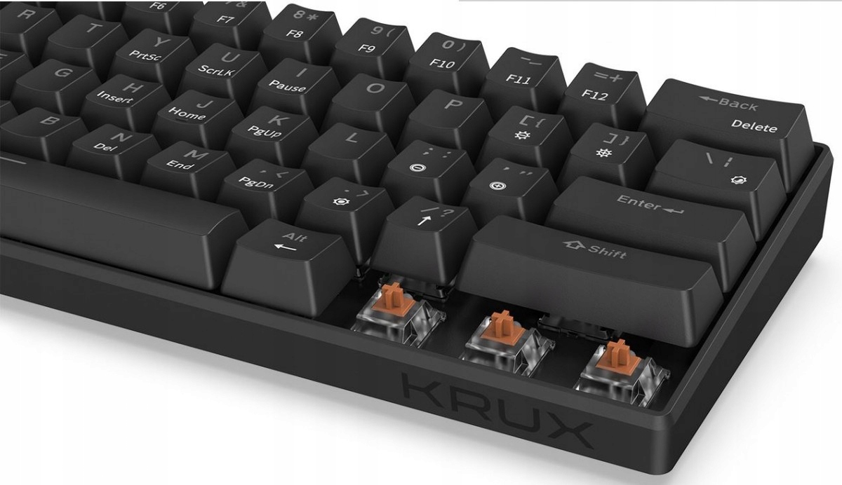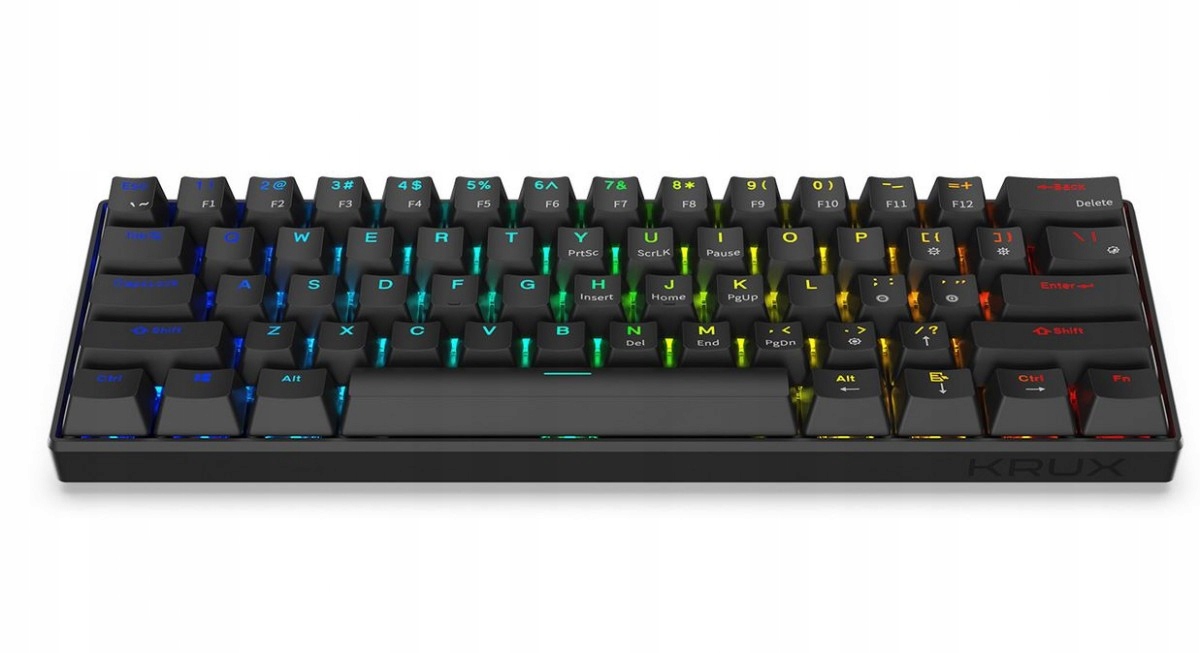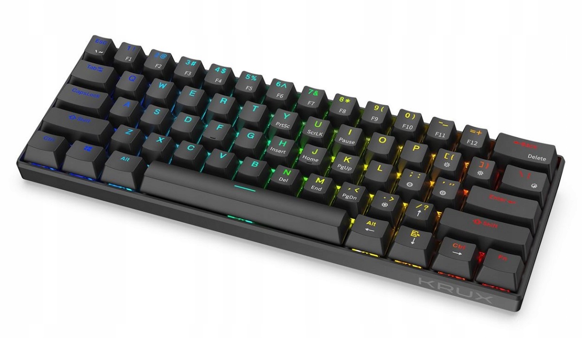 Małe klawiaturki takie jak KRUX Neo PRO RGB Gateron to rozwiązanie dla hardcorowych miłośników małej elektroniki. Mechanik w rozmiarze 60% został pozbawiony nie tylko bloku numerycznego, ale i strzałek, a nawet rzędu klawiszy funkcyjnych. Jednak bez nerwów, wszystko jest dostępne, trzeba tylko zmienić tryb za pomocą prostego skrótu klawiszowe. Oszczędność miejsca, przy jednoczesnym zachowaniu kluczowych funkcji. Klawiatura skrojona idealnie pod graczy z zamiłowaniem, jak i tych pragnących podłączenia do kilku urządzeń bez ciągnięcia dodatkowych kabli.