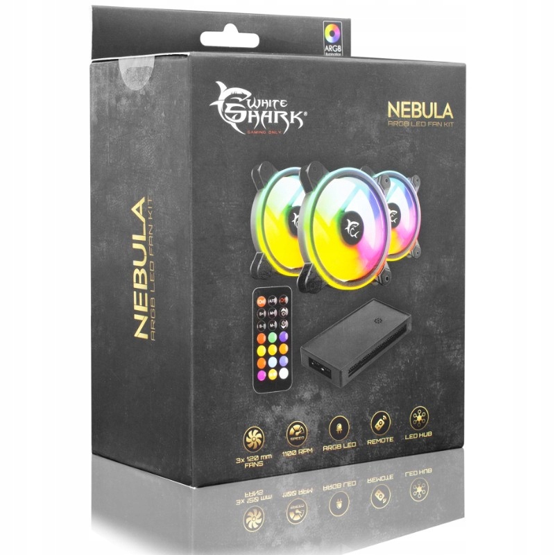 Zestaw NEBULA od WhiteShark składa się z 3 wentylatorów, akcesoriów niezbędnych do instalacji oraz pilota służącego do sterowania podświetleniem ARGB. Istnieje możliwość zdalnego sterowania ponad 200 efektami świetlnymi, dzięki czemu Twój pokój zyska unikalny, gamingowy klimat. Wentylator jest kompatybilny z AURA Sync, Mystic Light, RGB Fusion, ARGB Kontroleri. Do zestawu wentylatorów dołączony jest HUB LED na 10 wentylatorów ARGB, który umożliwia również sterowanie 2 paskami LED.