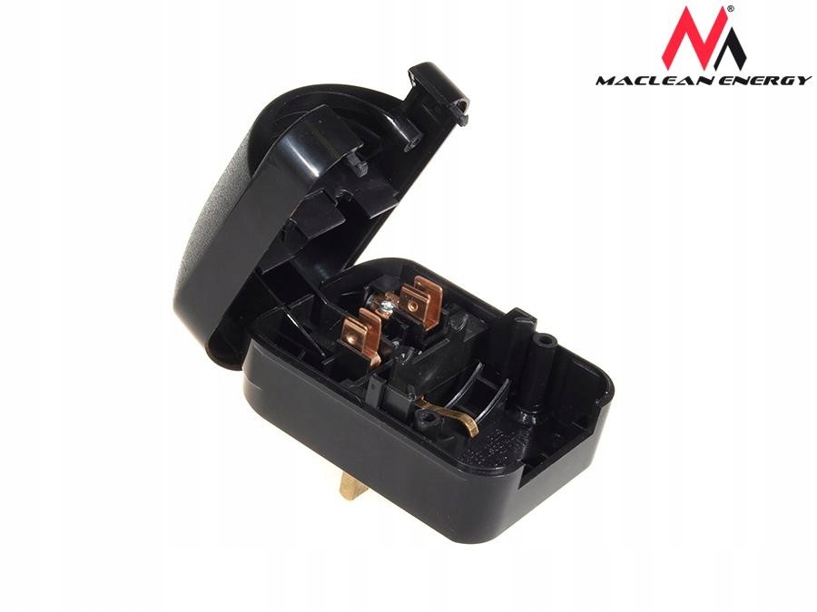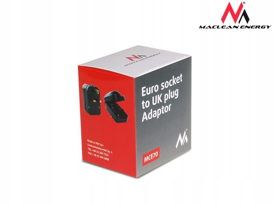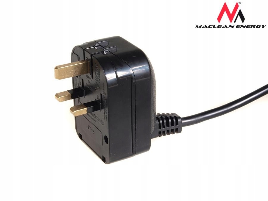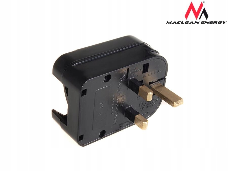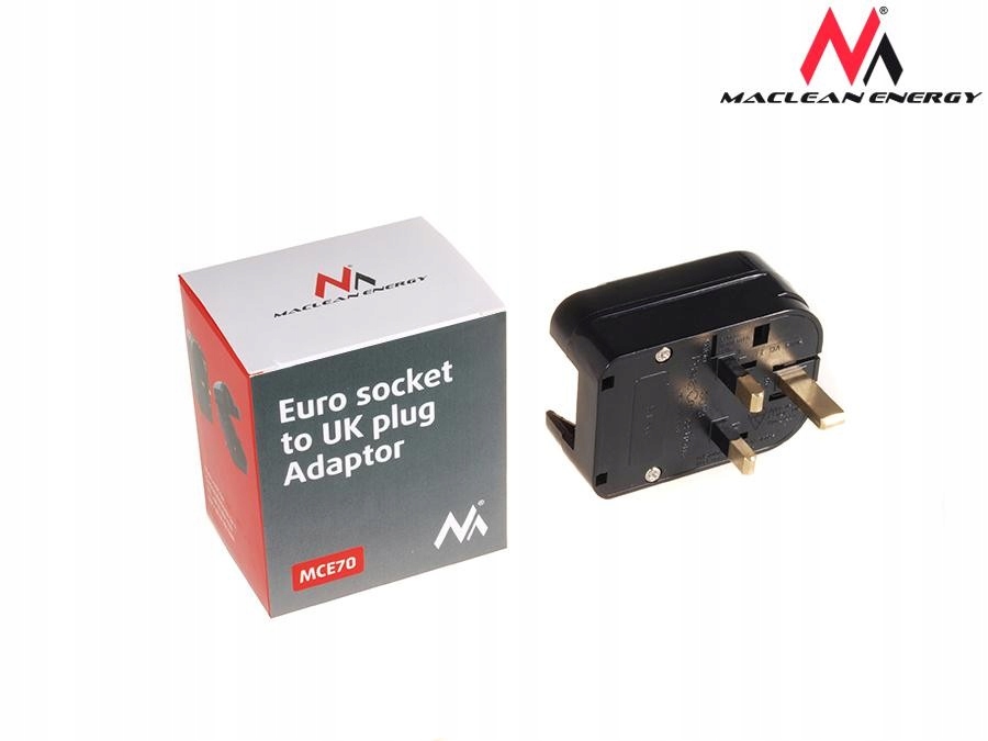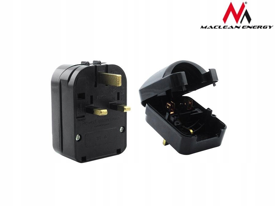 Adapter gniazdka sieciowego firmy Maclean umożliwiający podłączenie polskich urządzeń - w gniazdkach angielskich (wejście EU, wyjście UK). Przejściówka skręcana (zakładana na wtyczkę) z uziemieniem.