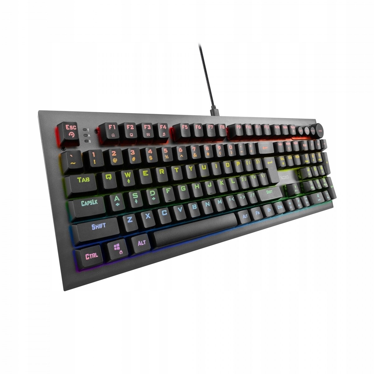 Pełnowymiarowa, mechaniczna klawiatura dla graczy z tęczowym podświetleniem Rainbow, odłączaną podpórka nadgarstków oraz antyghostingiem na wszystkich klawiszach.