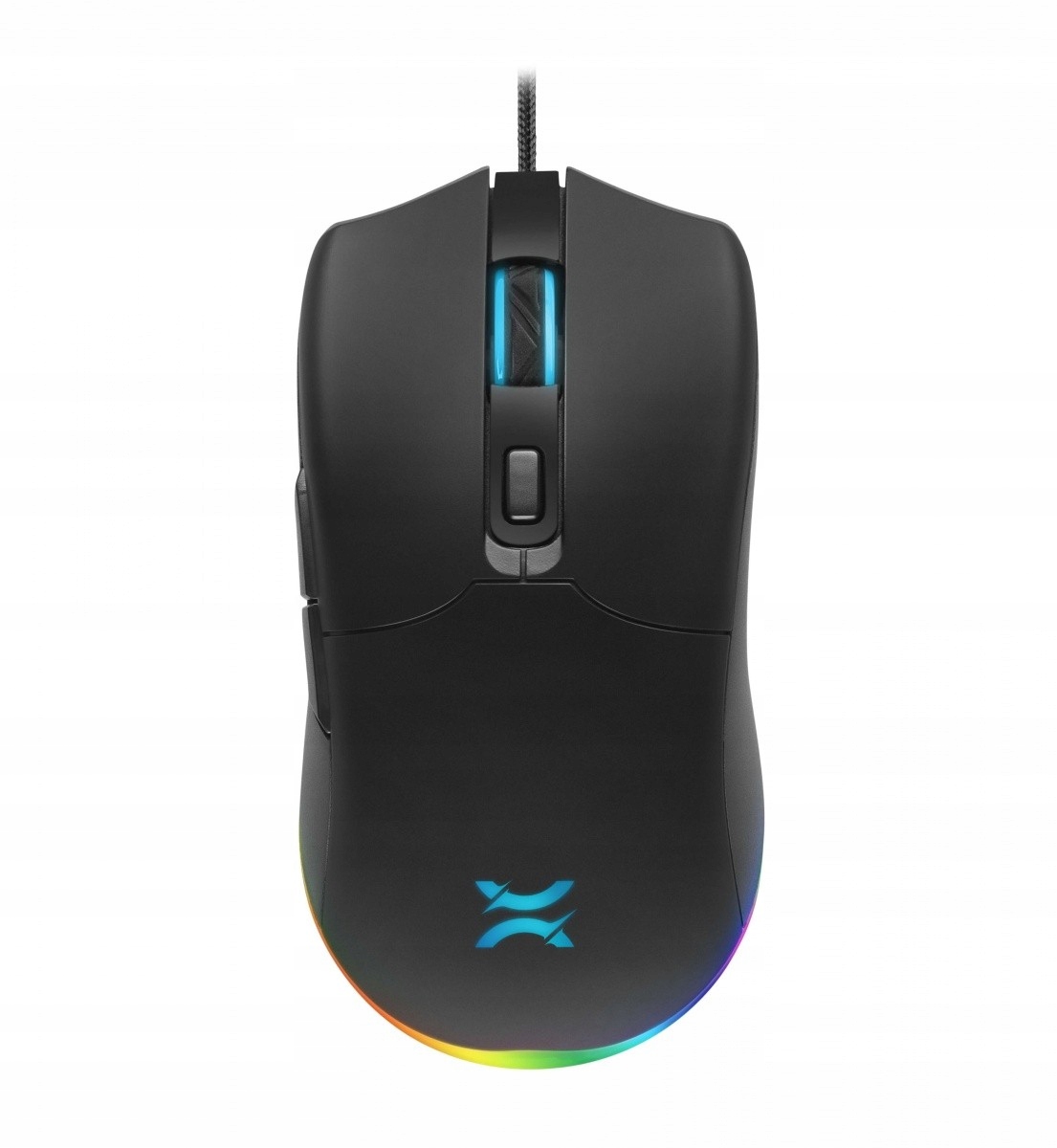 Ergonomiczna mysz dla graczy z wysokie klasy sensorem Sunplus 199 o zmiennej czułości, programowalnymi przyciskami, dedykowany oprogramowaniem i wielokolorowym podświetleniem RGB.