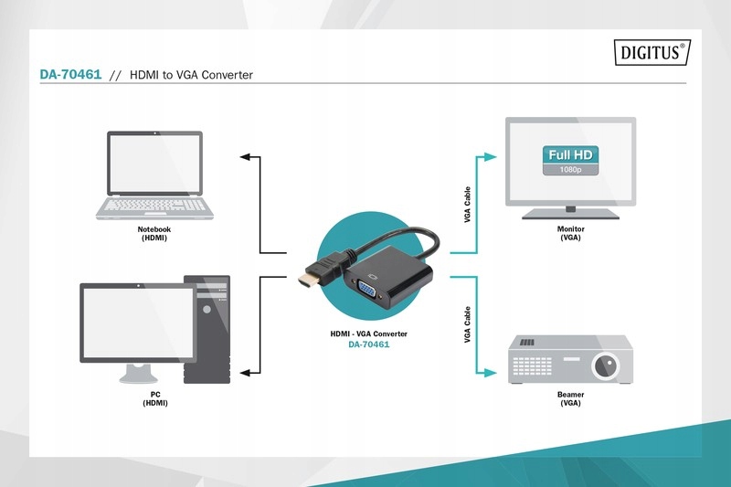 Dzięki temu można połączyć nowoczesne urządzenia odtwarzające, takie jak notebooki, odtwarzacze Blue Ray, odtwarzacze DVD, konsole do gry itd., ze starszymi ekranami VGA lub rzutnikami komputerowymi VGA. Konwerter posiada dodatkowo gniazdo audio mini jack 3,5 mm. Dzięki temu następuje równoczesna konwersja ewentualnego sygnału audio. Umożliwia to dodatkowe odtwarzanie audio po podłączeniu głośników lub systemu surround.