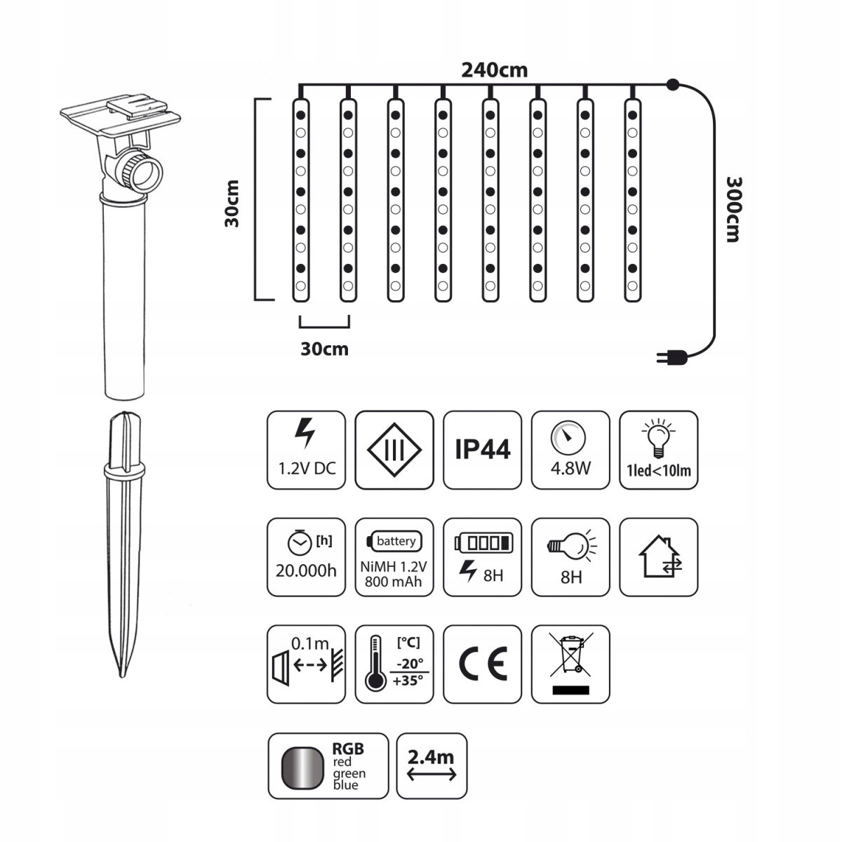 Niezwykle efektowne lampki solarne MCE412 zasilane energią słoneczną, stanowią tanie, niezawodne, efektywne oraz przyjazne dla środowiska naturalnego dekoracyjne oświetlenie. Nadają się do stosowania zarówno w środku pomieszczeń jak i na zewnątrz. Dzięki innowacyjnej formie zwisających sopli, lampki świetnie sprawdzą się do ozdabiania tarasu, patio, werandy, ganku, itp. Lampki składają się z 8 segmentów w formie sopli o długości 30 cm. Na lampkach znajdują się 144 diody LED świecące w kolorach: niebieskim, czerwonym i zielonym. Po pełnym naładowaniu akumulatora lampki świecą nawet do 8 godzin.