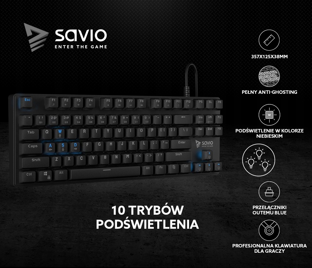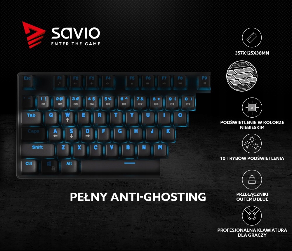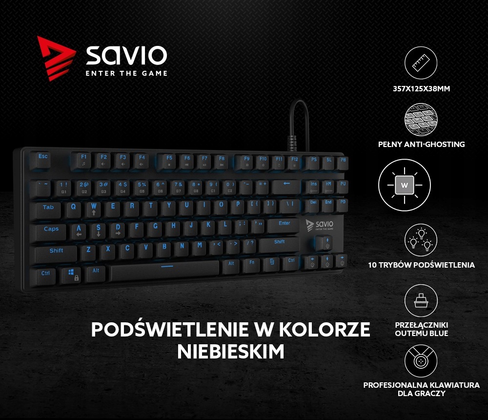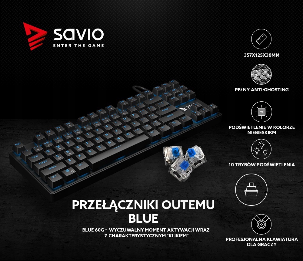 Klawiatura mechaniczna gamingowa Savio Tempest RX Outemu Blue, podświetlenie LED niebieskie, NKRO, Anty-ghosting