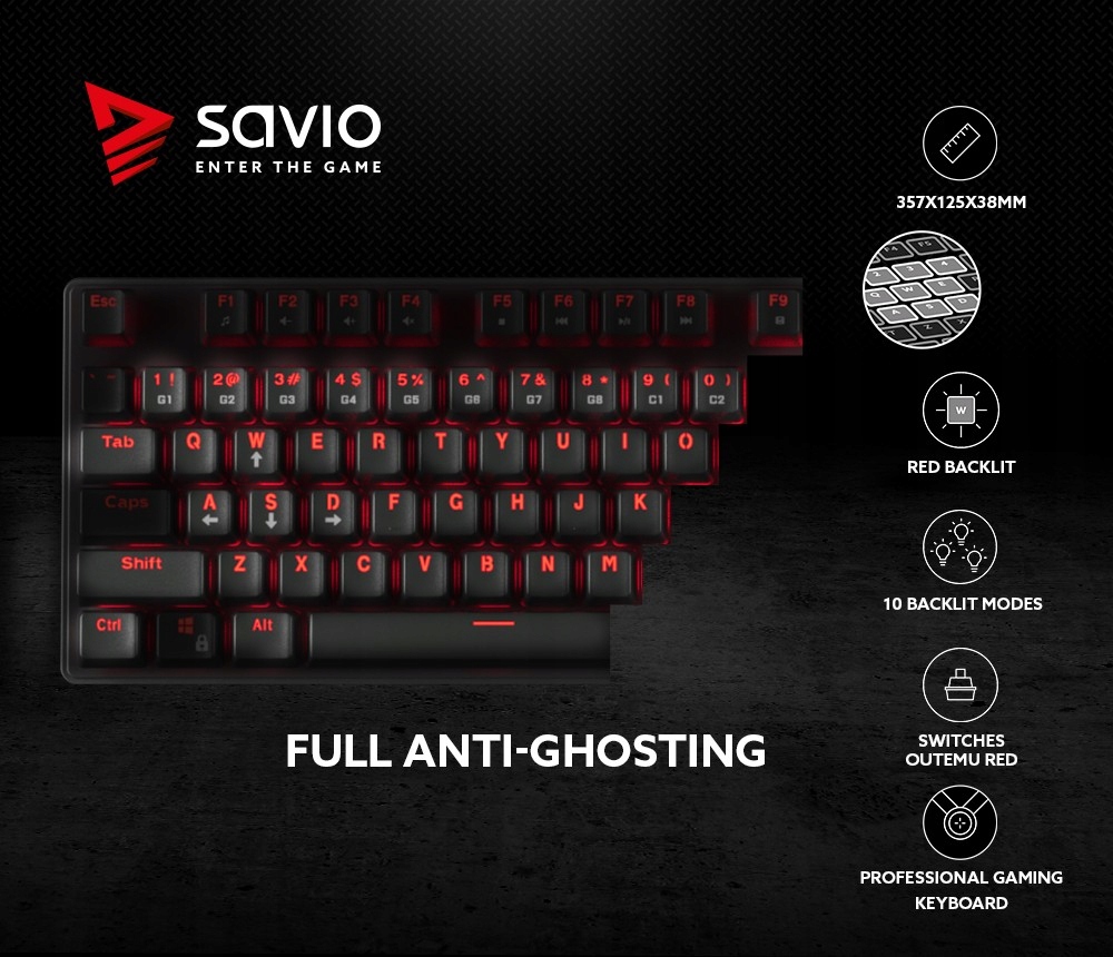 Klawiatura Gamingowa SAVIO Tempest RX TKL stworzona z wysokiej jakości komponentów posiada 87 nieścieralnych przycisków wyprodukowanych metodą double incjection. Kompaktowy rozmiar ułatwia transport, natomiast wytrzymała konstrukcja oraz aluminiowa powierzchnia klawiatury sprosta wielogodzinnym bataliom w ulubionej grze. Dodatkowym udogodnieniem w modelu SAVIO Tempest RX jest możliwość regulowania wysokości. Klawiatura Gamingowa SAVIO została wyposażona w gumowe stopki, zyskując tym samym właściwości antypoślizgowe.
