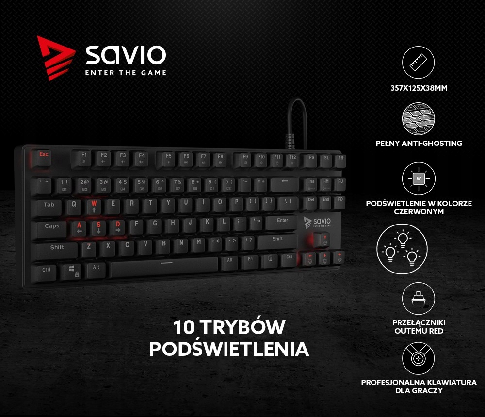 Klawiatura SAVIO Tempest RX to nie tylko wytrzymała konstrukcja, ale również szybki czasy reakcji, dzięki czemu jest to idealne narzędzie do wielogodzinnych sesji z ulubioną grą. Stworzona z myślą o graczach, szybko reaguje na polecenia oraz jest niezwykle wydajna. Praktyczny, minimalistyczny design opracowano tak, aby zapewnić maksimum wygody i komfortu. Dla nadania gamingowego charakteru klawiatura posiada podświetlane klawisze w kolorze czerwonym wraz z możliwością wyboru ponad 10 efektownych trybów.