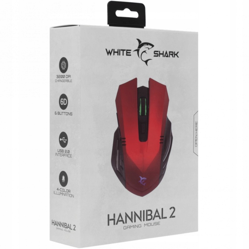 Mysz gamingowa WhiteShark Hannibal 2 charakteryzuje się drapieżnym, typowo gamingowym kształtem dobrze układającym się w dłoni. Została wykonana z wytrzymałego tworzywa sztucznego, a powierzchnię myszy wykończono gumową powłoką, dzięki czemu jest przyjemna w dotyku. Mysz Hannibal 2 ma 6 przycisków (6D), czujnik optyczny INSTANT 704 oraz możliwość wyboru rozdzielczości między 1200/1600/2400/3200 DPI, co gwarantuje precyzję niezależnie od tego, w jakie gry najczęściej grasz.