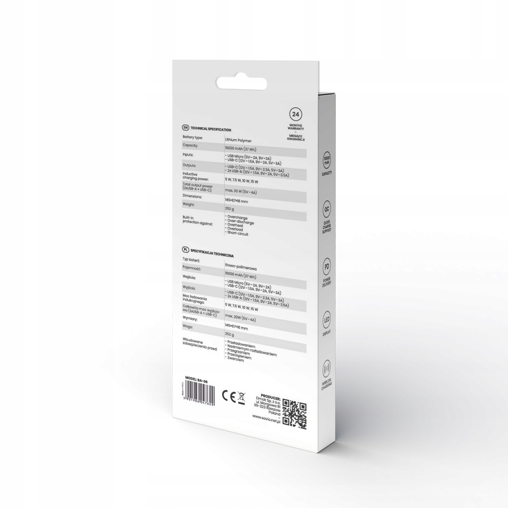 Power bank BA-06 to funkcjonalne urządzenie pozwalające na ładowanie przenośnych urządzeń takich jak smartfony, tablety czy smartwatche za pomocą kabla lub indukcyjnie. Kompaktowy rozmiar oraz wygląd umożliwiają łatwość przenoszenia i praktyczne wykorzystanie go w trakcie wyjazdów.