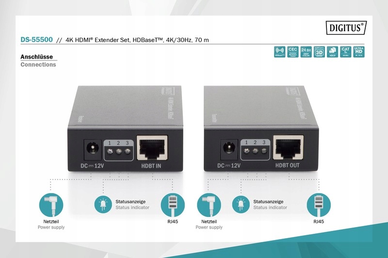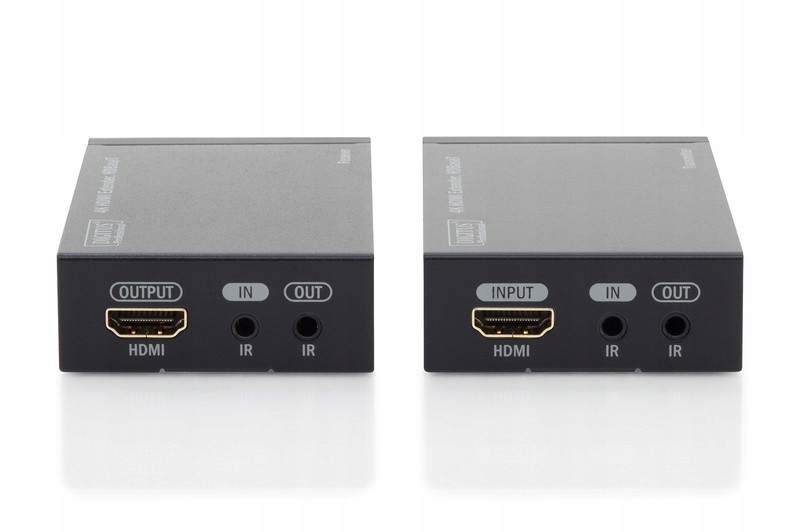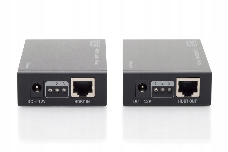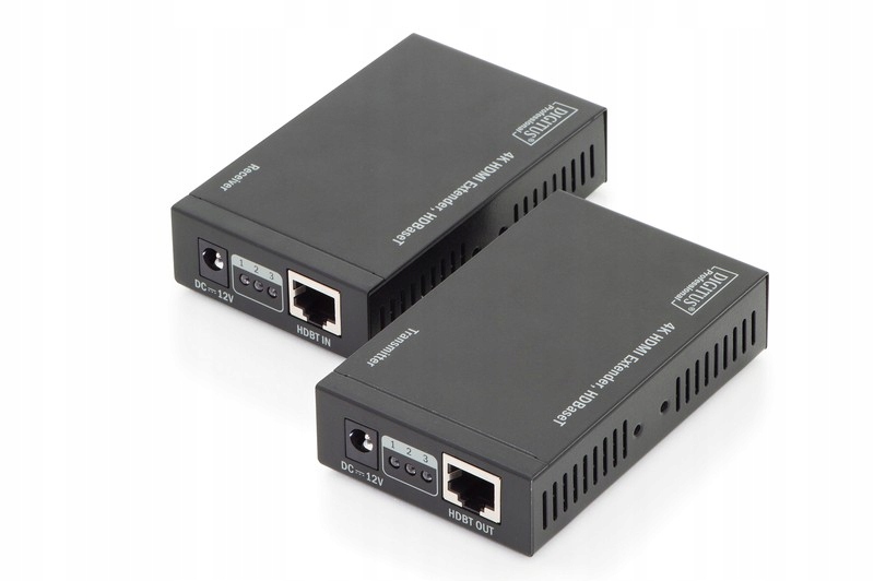 Zestaw przedłużacza sygnału wideo Digitus 4K, HDBaseT to rozwiązanie do przedłużania sygnału wideo do 70 m spełniające najwyższe wymagania zarówno w zakresie prezentacji graficznych o wysokiej rozdzielczości, jak i absolutnie płynnego odtwarzania wideo. Przesyła cyfrowe sygnały wideo i audio na maksymalną długość do 70 m. Treści 4K można przesyłać na odległość do 40 m przy użyciu kabla sieciowego CAT 6. Składa się z nadajnika i odbiornika. Dzięki obsłudze PoH wystarczy jedynie zasilanie energią elektryczną odbiornika (zalecane) poprzez załączony zasilacz. W zestawie znajdują się także dwa dwukierunkowe moduły na podczerwień (nadajnik, odbiornik), poprzez które można za pomocą pilota zdalnie sterować podłączonym źródłem sygnału wejściowego.