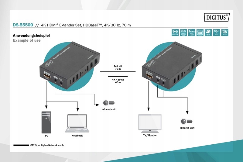 Zwiększa długość maksymalną kabla HDMI do 70 m, przy czym pomiędzy nadajnikiem a odbiornikiem stosuje się tylko pojedynczy kabel sieciowy