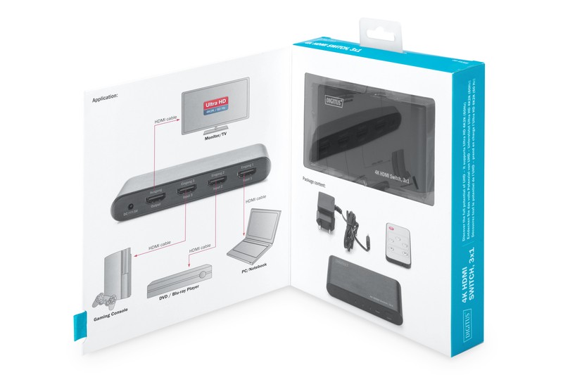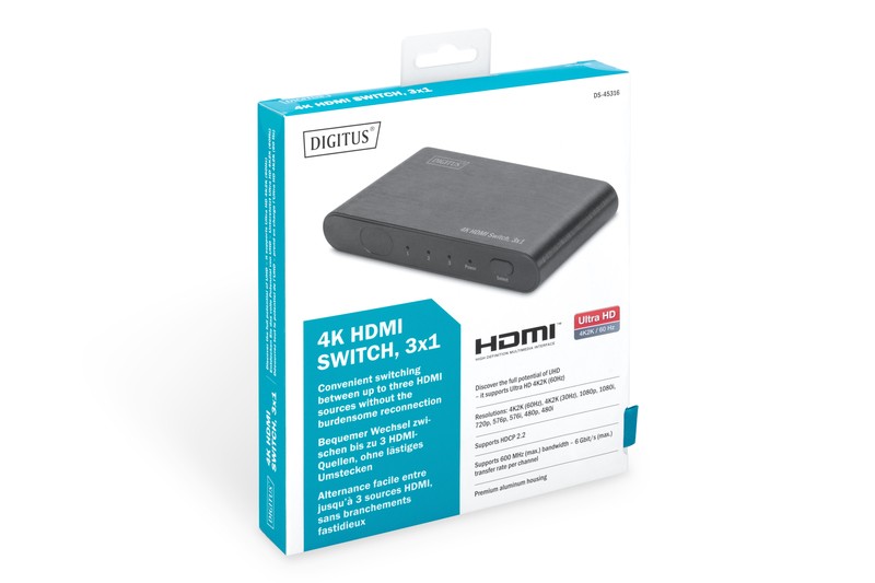 Przełącznik Digitus 4K HDMI 3x1 umożliwia wygodną zmianę pomiędzy 3 wejściami HDMI (odtwarzacz DVD/Blu-Ray, konsola do gier, urządzenia do strumieniowego przesyłania danych, odbiornik cyfrowy, itp.) za pomocą zdalnego sterowania, zintegrowanego automatycznego rozpoznawania lub alternatywnie samodzielnie za pomocą przełącznika. Możesz zapomnieć o uciążliwym przełączaniu kabli. Obsługa formatu Ultra HD 4K2K (60 Hz) pozwala cieszyć się multimediami w wyjątkowo wysokiej rozdzielczości.