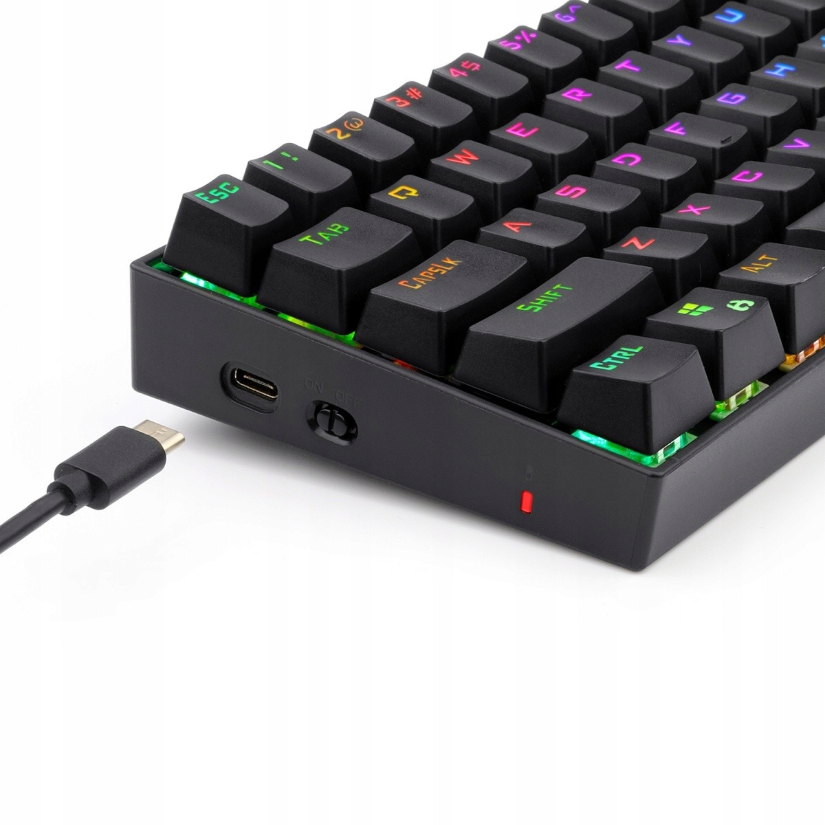 Poza standardową i dla wielu graczy jedyną słuszną opcją łączności przewodowej, klawiatura Redragon Draconic oferuje również możliwość bezprzewodowego połączenia dzięki dołączonemu odbiornikowi USB pracującemu w paśmie 2.4 GHz. Wbudowany akumulator wystarczy wtedy nawet na 350 godzin pracy przy wyłączonym podświetleniu, przy włączonym czas ten skraca się do 20 godzin. O niskim poziomie baterii poinformuje Cię miganie podświetlenia.