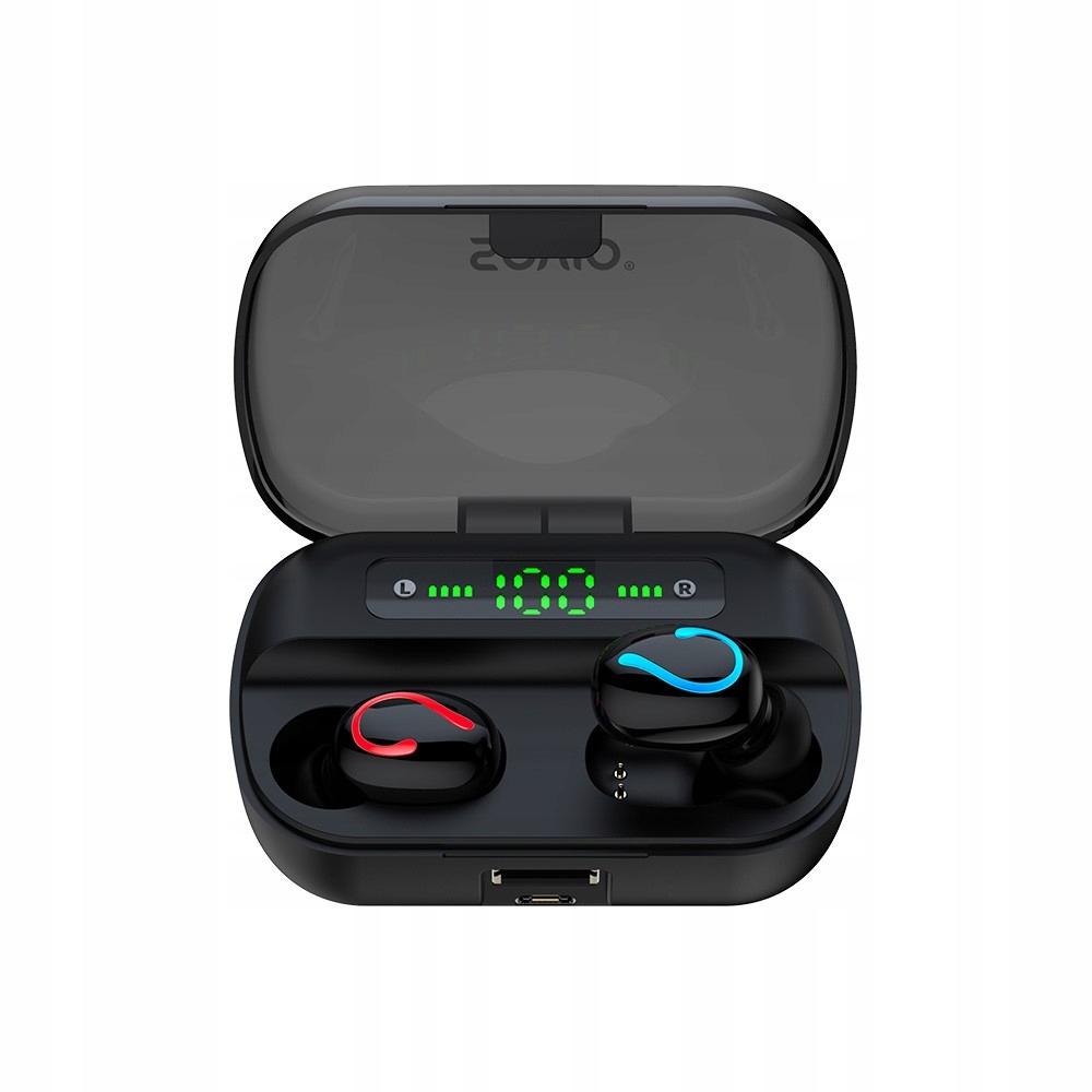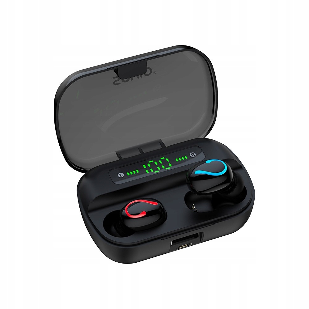 - Opakowanie zawiera: bezprzewodowe słuchawki Bluetooth, kabel ładowania, power bank, 5 par wkładek dousznych, instrukcję obsługi