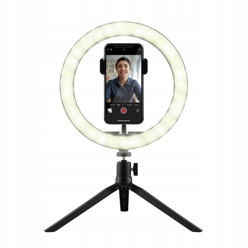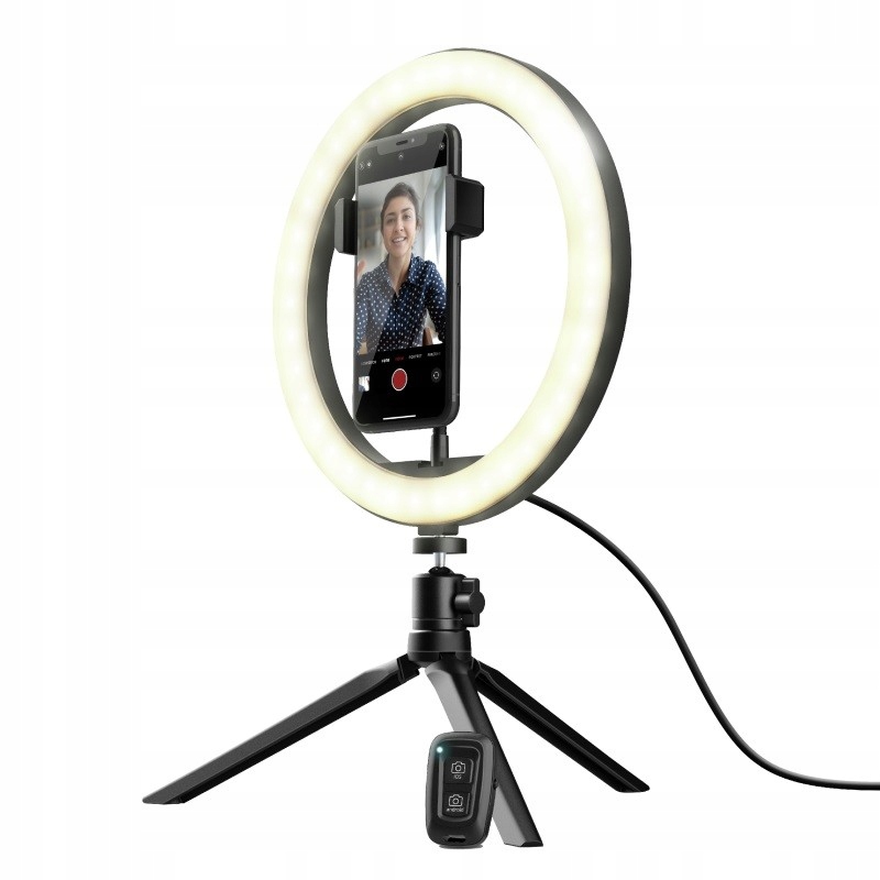Jeszcze lepsze vlogi dzięki 25-centymetrowej lampie pierścieniowej z pilotem, statywem i uchwytem na telefon.