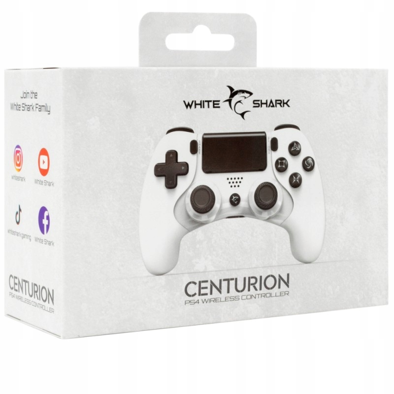Pad CENTURION od WhiteShark wyróżnia się biało-czarną kolorystyką, która nawiązuje do czarnego koloru konsoli. Wyposażony został w baterię litowo-polimerową o pojemności 600 mAh, która umożliwia od 6 do 8 godzin nieprzerwanej pracy. Technologia Bluetooth 2.1 + EDR umożliwia bezprzewodową pracę w zasięgu 8-10 m od połączonego urządzenia. Kontroler jest kompatybilny bezprzewodowo z konsolą PlayStation 4 oraz z konsolą PlayStation 3 za pomocą przewodu.