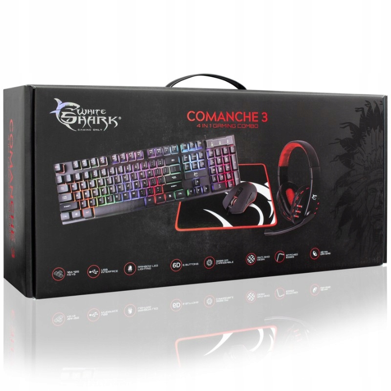 Zestaw gamingowy WhiteShark Comanche 3 składa się z 4 produktów: pełnowymiarowej, przewodowej klawiatury, przewodowej myszy optycznej, podkładki pod mysz i słuchawek z mikrofonem. Optymalny zestaw dla graczy, którzy rozpoczynają swoją przygodę z gamingiem oraz dla osób, które cenią sobie wysokie parametry podczas pracy.